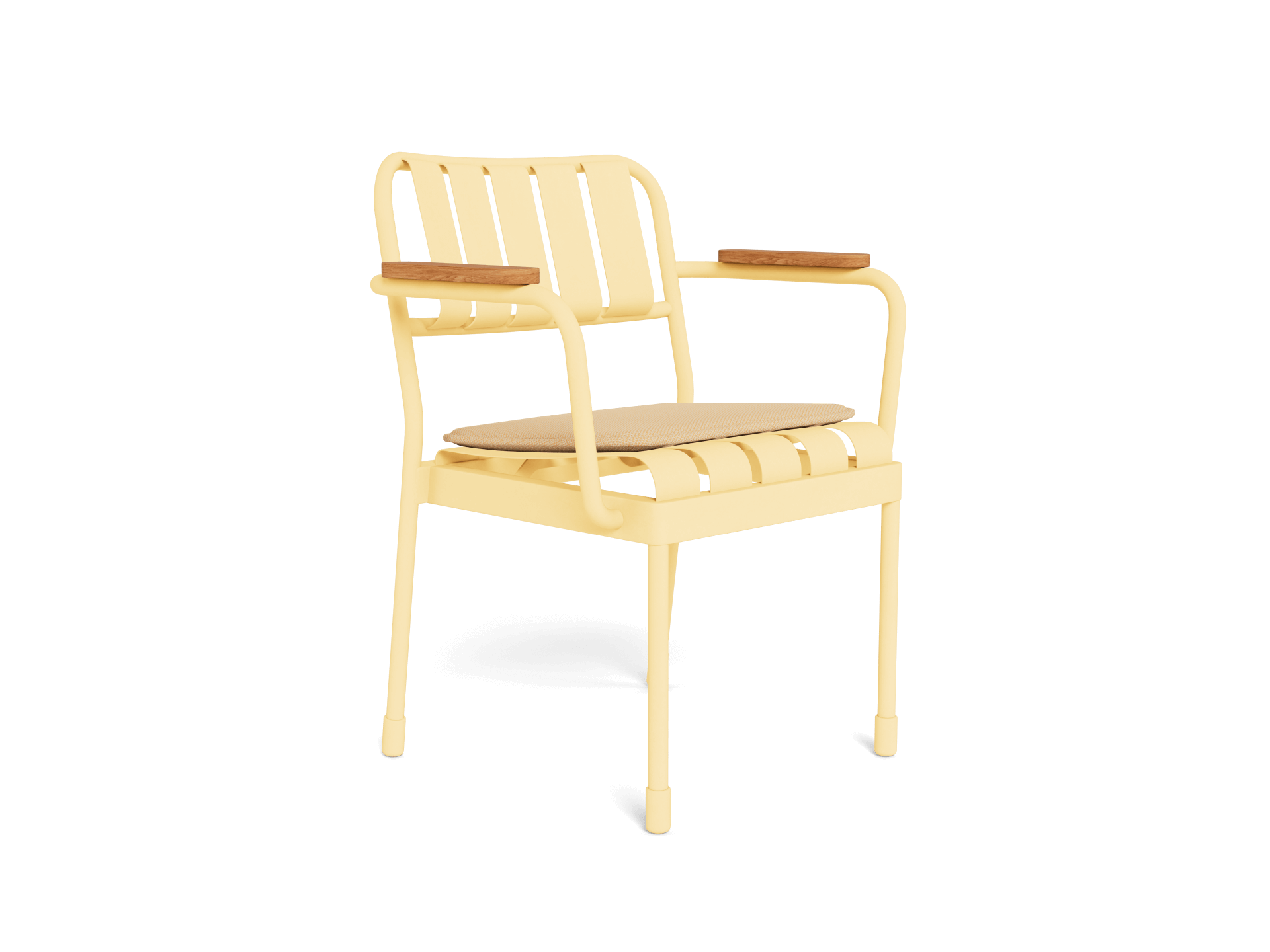 Yellow outdoor chair with slatted design, wood armrests, and a width of 67 cm.