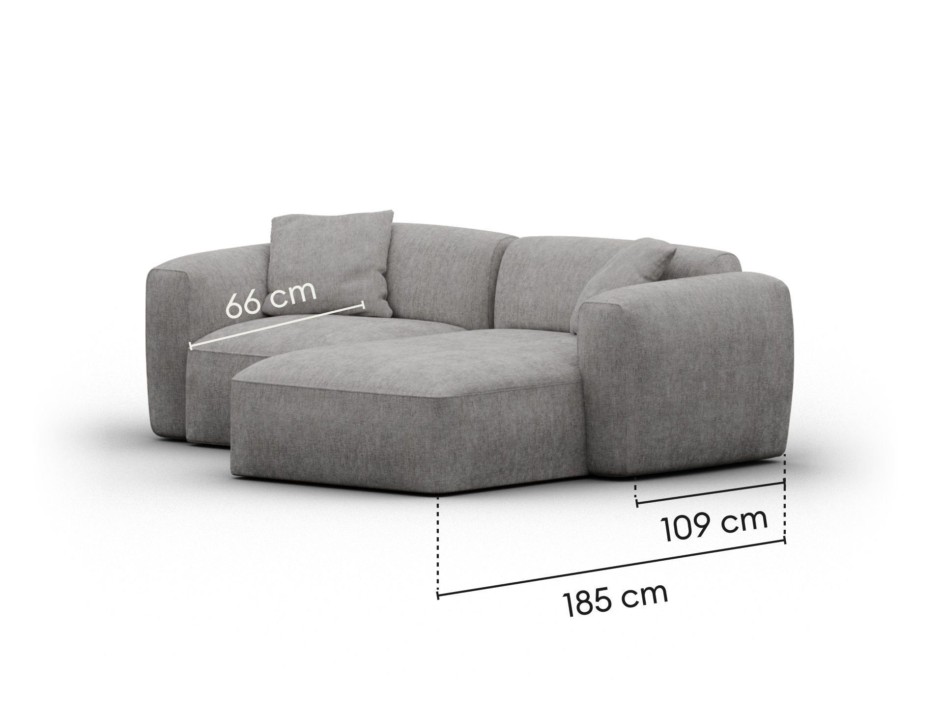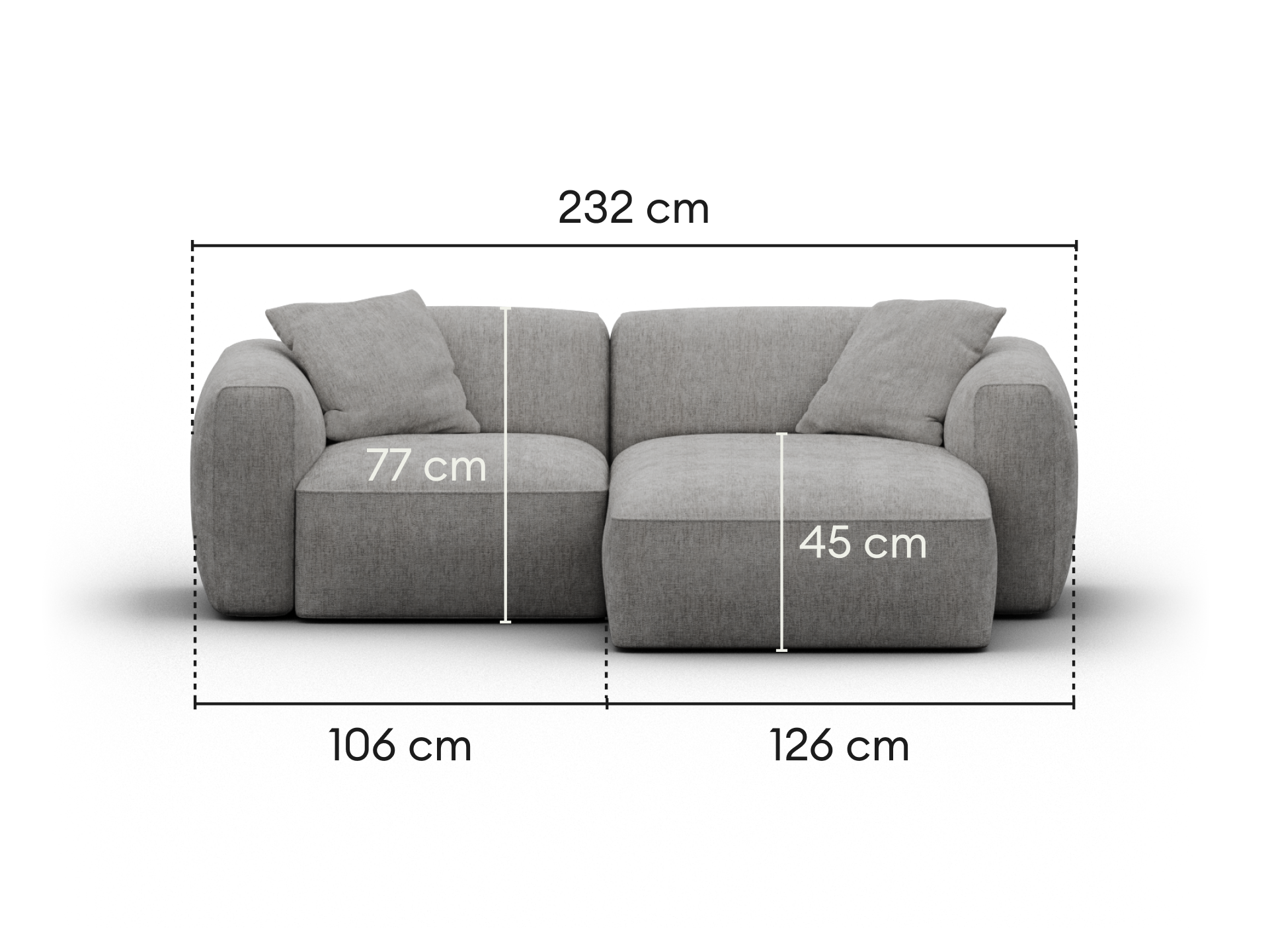 Each chaise, sofa and armrest configuration comes with two cushions. A corner configuration comes with two extra cushions.